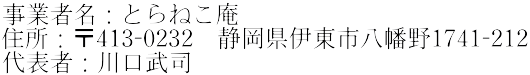 送付先住所:〒413-0232 静岡県伊東市八幡野1741-212 とらねこ庵 お問い合わせ窓口